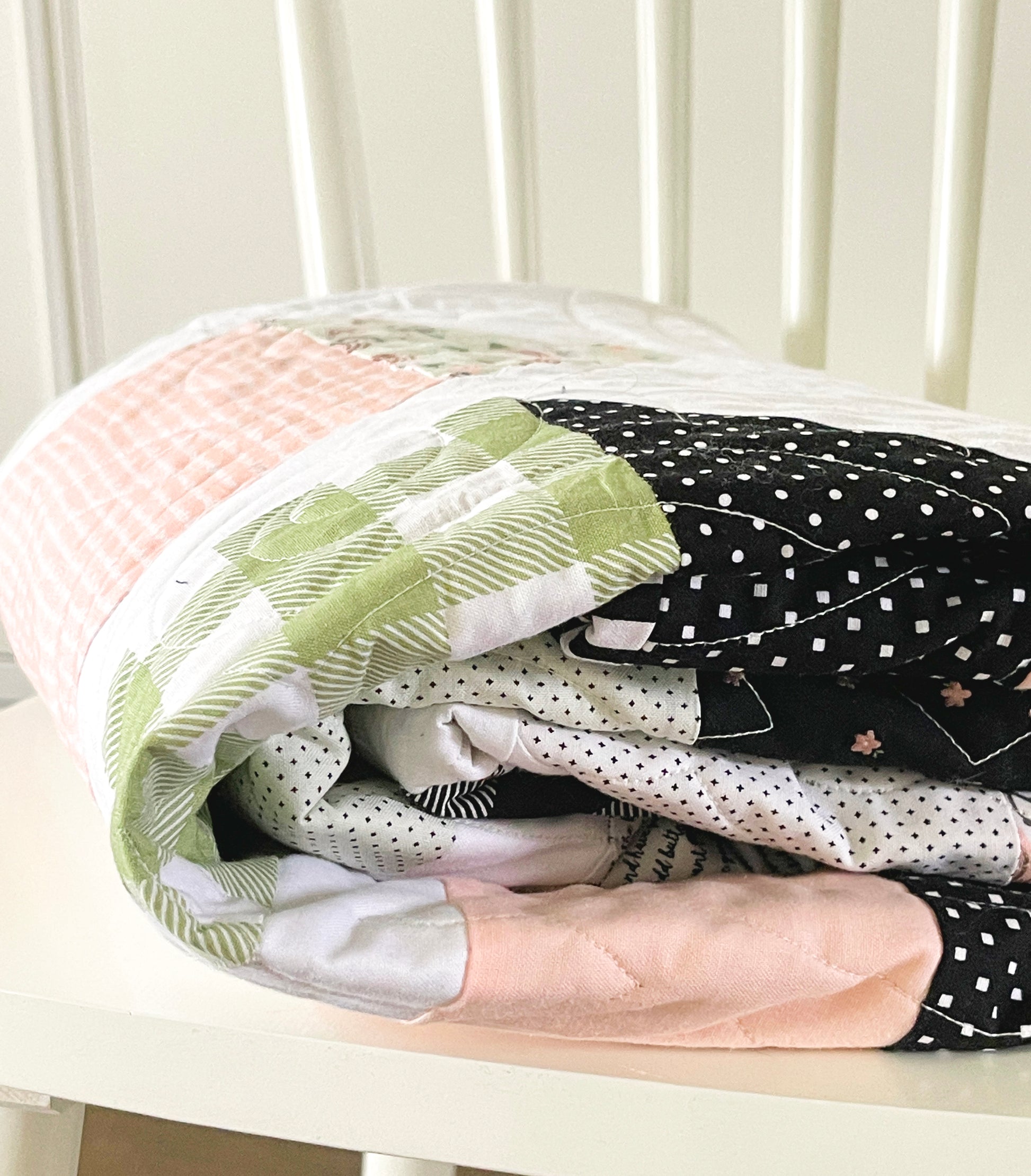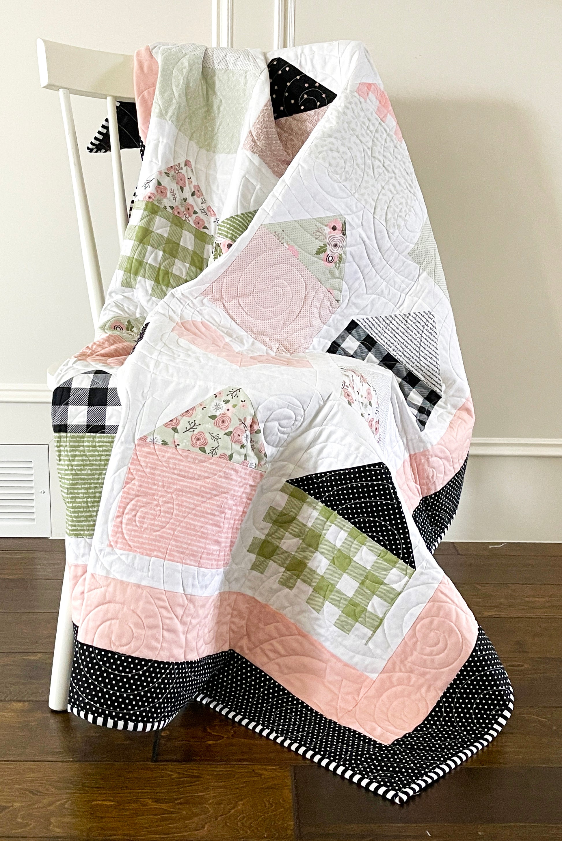 This quilt pattern is made for beginners to advanced quilters and uses 9” scraps of fabric (or 1/4 yard cuts) so it makes it a cinch to sew up! Finished quilt size is approximately 56”x 60.”