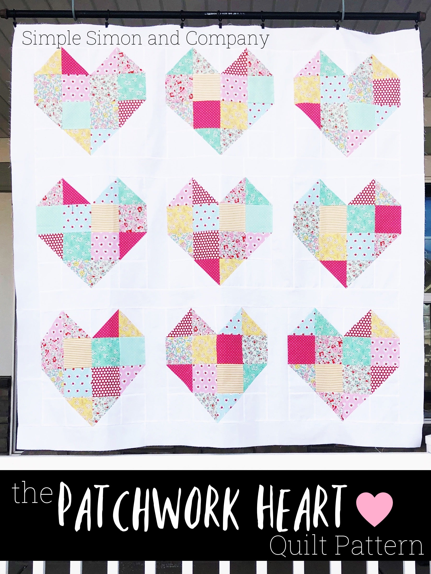 The Patchwork Heart Quilt Pattern is an easy block by block assembly quilt top that is great for beginners. Each heart block is assembled in a 16 patch style and works great with both pre-cut packs and scraps. With an easy layout this quilt pattern is great for both beginners and experienced quilters alike.